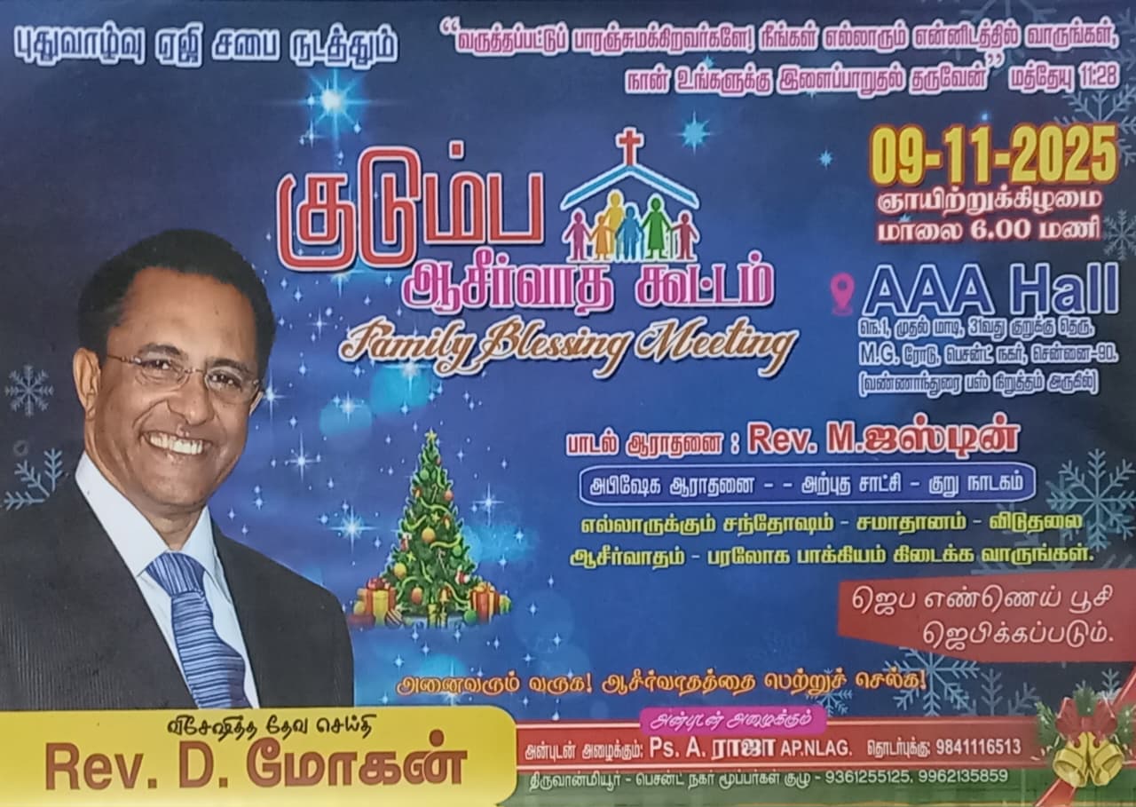 குடும்ப ஆசீர்வாதக் கூட்டம் ஞாயிற்றுக்கிழமை, 9-நவம்பர்-2025 மாலை 6:00 மணிக்கு சென்னை பெசன்ட் நகரில் நடைபெறும்.