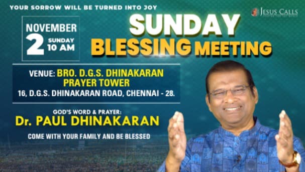 ஞாயிற்றுக்கிழமை ஆசீர்வாதக் கூட்டம் ஞாயிற்றுக்கிழமை, 2-நவம்பர்-2025 காலை 10 மணி முதல் சென்னை சகோ. டி.ஜி.எஸ். தினகரன் பிரார்த்தனை கோபுரத்தில் நடைபெறும்.