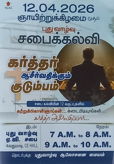 CHURCH EDUCATION on Family Blessed by God from 12-April-2026 onwards covering many topics shown below @ NLAG, Little Mount, Chennai