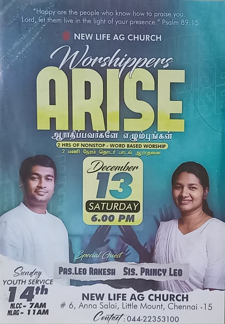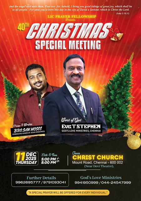 குடும்ப ஆசீர்வாதக் கூட்டம் ஞாயிற்றுக்கிழமை, 9-நவம்பர்-2025 மாலை 6:00 மணிக்கு சென்னை பெசன்ட் நகரில் நடைபெறும்.