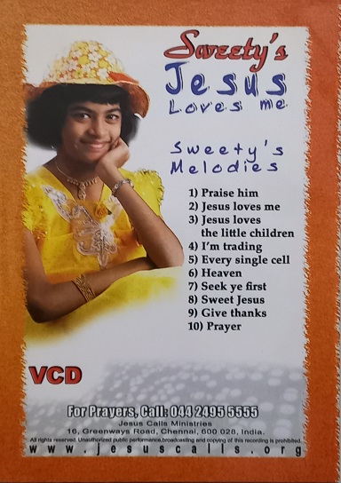 This VCD “Sweety’s Jesus Loves Me” ” is available for free (with refundable deposit) lending within India. For details visit https://cmedialending.in/example-to-take-a-video-made-in-india/