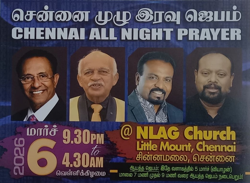 CHENNAI ALL NIGHT PRAYER on Friday 6-March-2026 from 9:30 p.m.at NLAG Church, Little Mount, Chennai