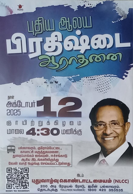 New Church (25,000 capacity stadium for God’s kingdom) Dedication Worship at 4:30 p.m. on Sunday, 12-October-2025 at New Life Celebration Centre (CC), Chennai.